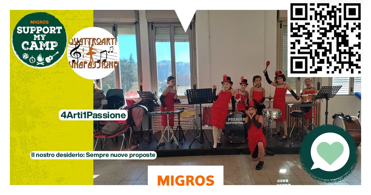 Quattroarti Unapassione desidera proporre a bambini e ragazzi dei camp esperienze sempre diverse: oltre ai laboratori di teatro, danza, musica e arti visive che già proponiamo, vogliamo esplorare il nostro territorio: uscite nei parchi acquatici, visita alle miniere e allo zoo… Con i buoni Migros possiamo realizzarlo e rendere l’offerta più allettante.